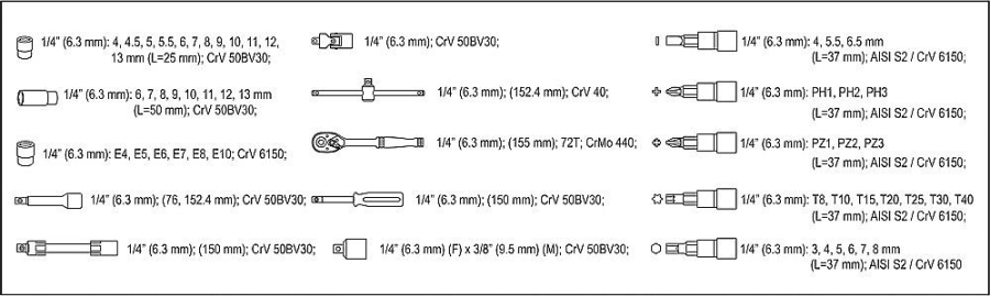 | 12x | nástavec 1/4": 4; 4.5; 5; 5.5; 6; 7; 8; 9; 10; 11; 12, 13 mm (L= 25 mm) |