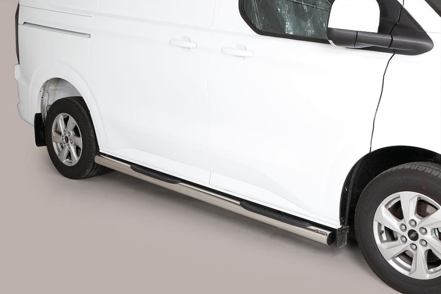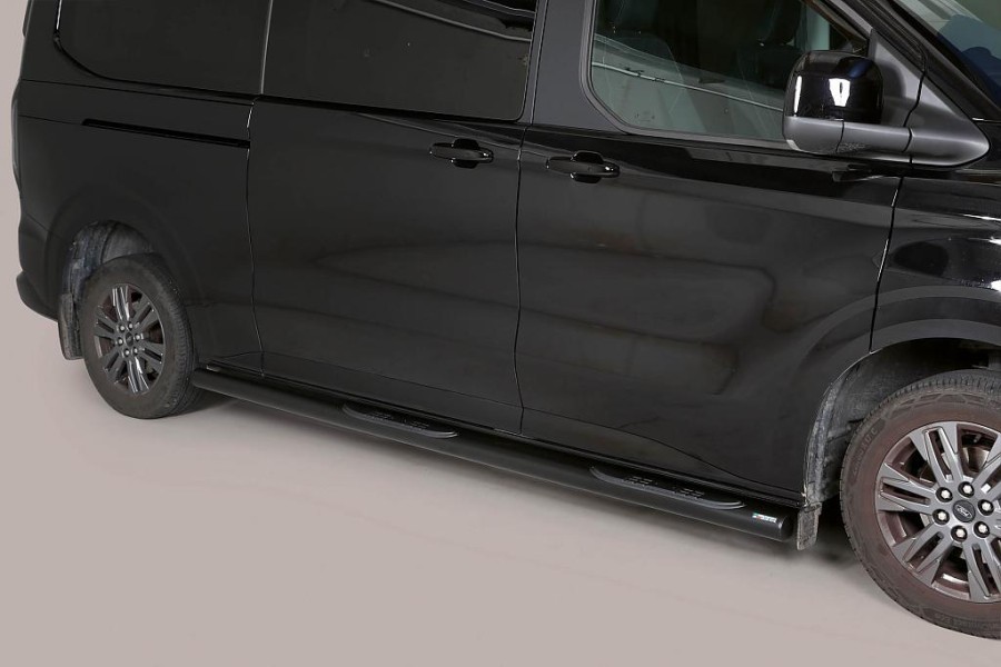 Nerezový boční rám - průměr 76mm s černými plastovými stupátky pro FORD Transit / Tourneo Custom L2 - rozvor 3500mm, od r.v. 2024->>