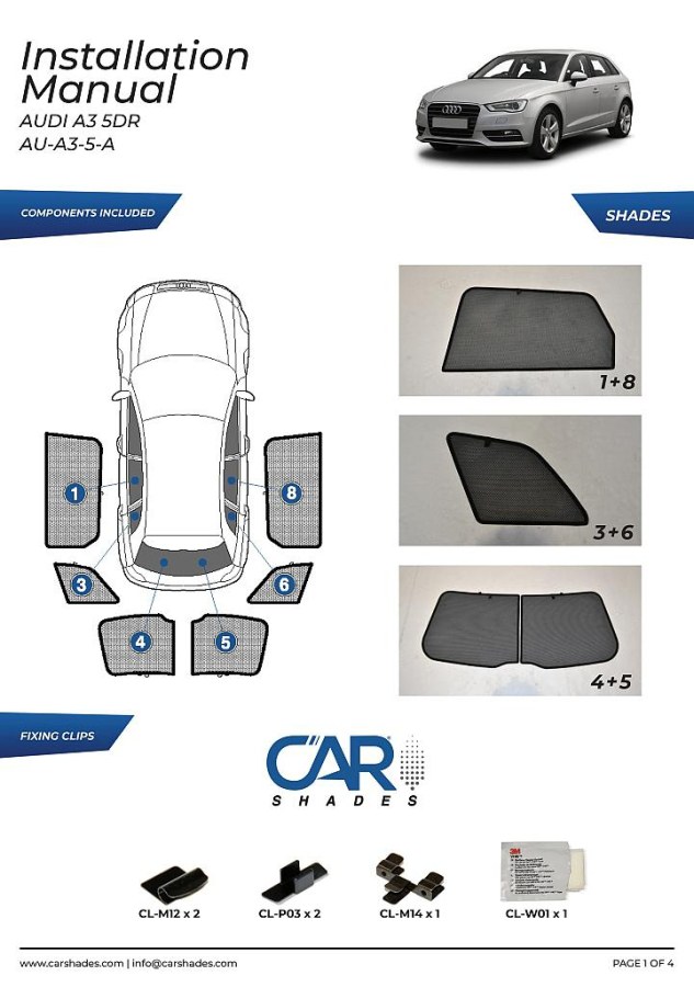 kompletní sada (6 ks zadní + zadní boční okna) slunečních clon CarShades pro AUDI A3/S3 5-dvéř. hatchback, r.v. 2003 - 2013